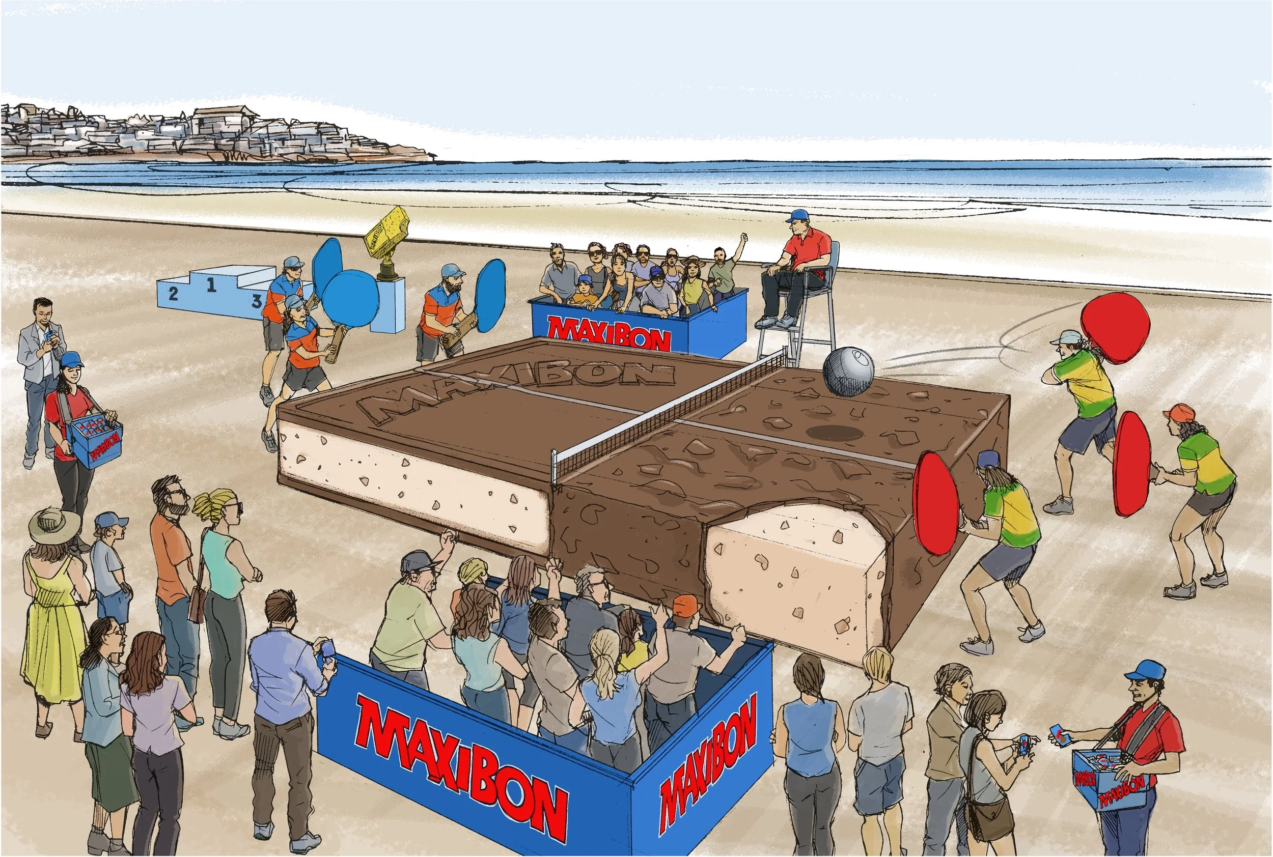 Game. Set. Smash! One side Biccie, one side Choc. We'll create a jumbo Maxibon ping pong table big enough for multiple mates to play and huge paddles to 'smash' and 'cream' the competition.